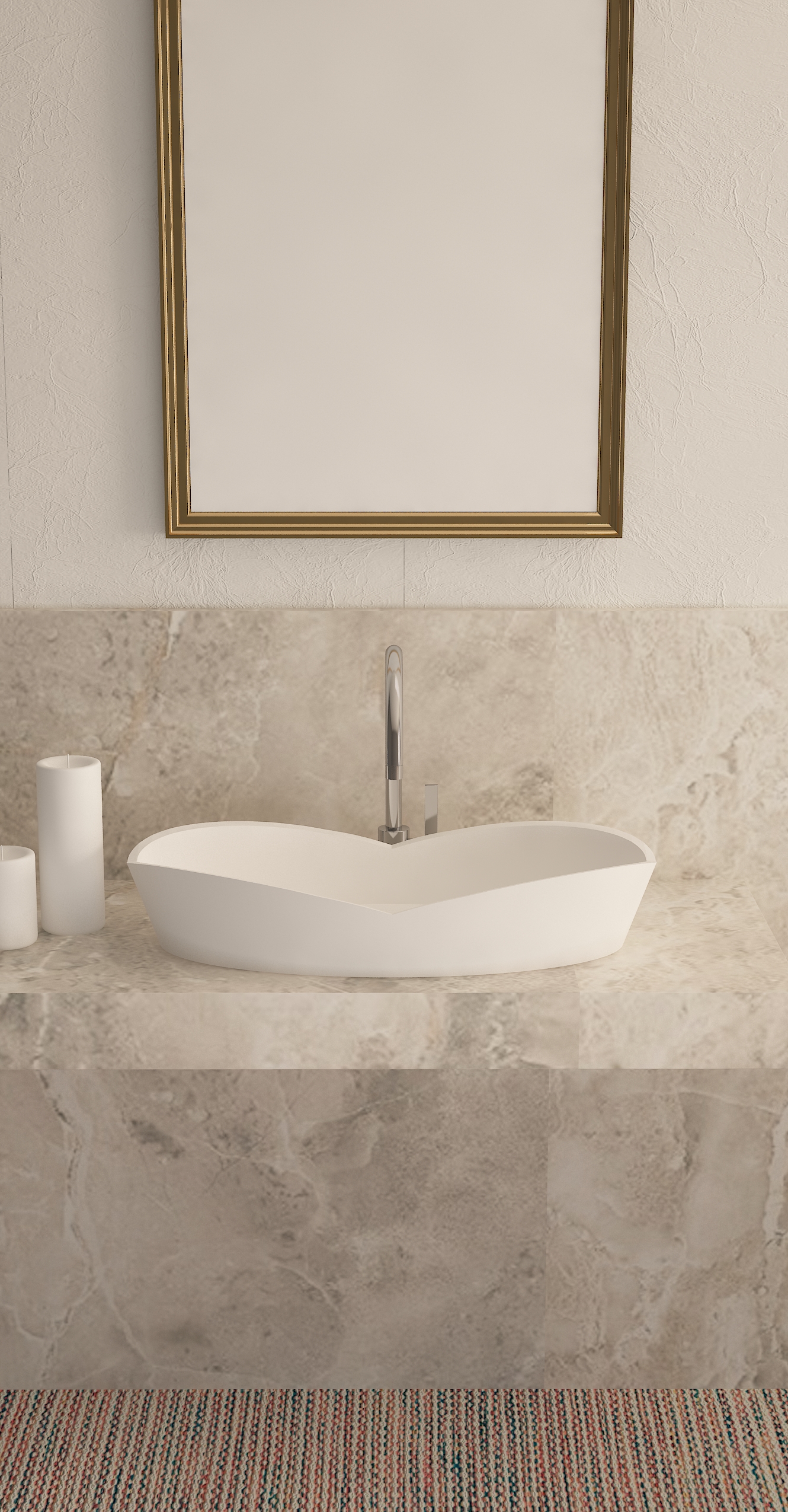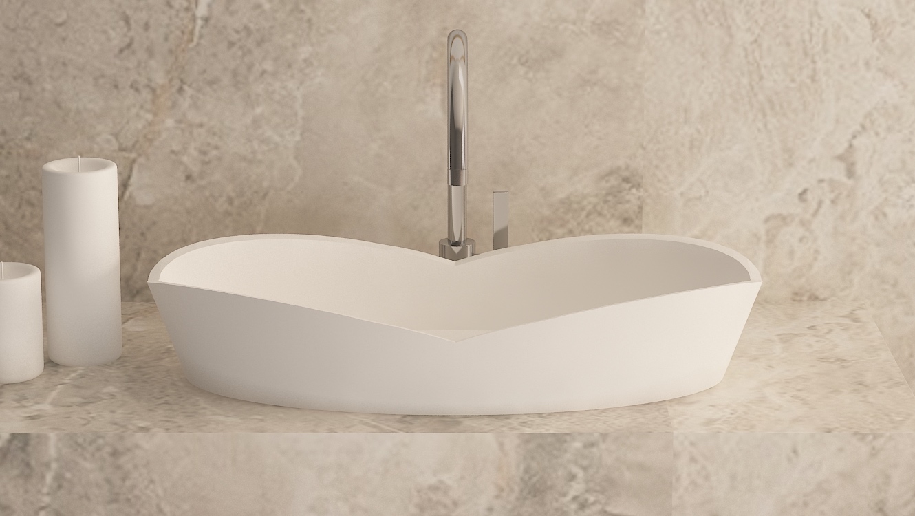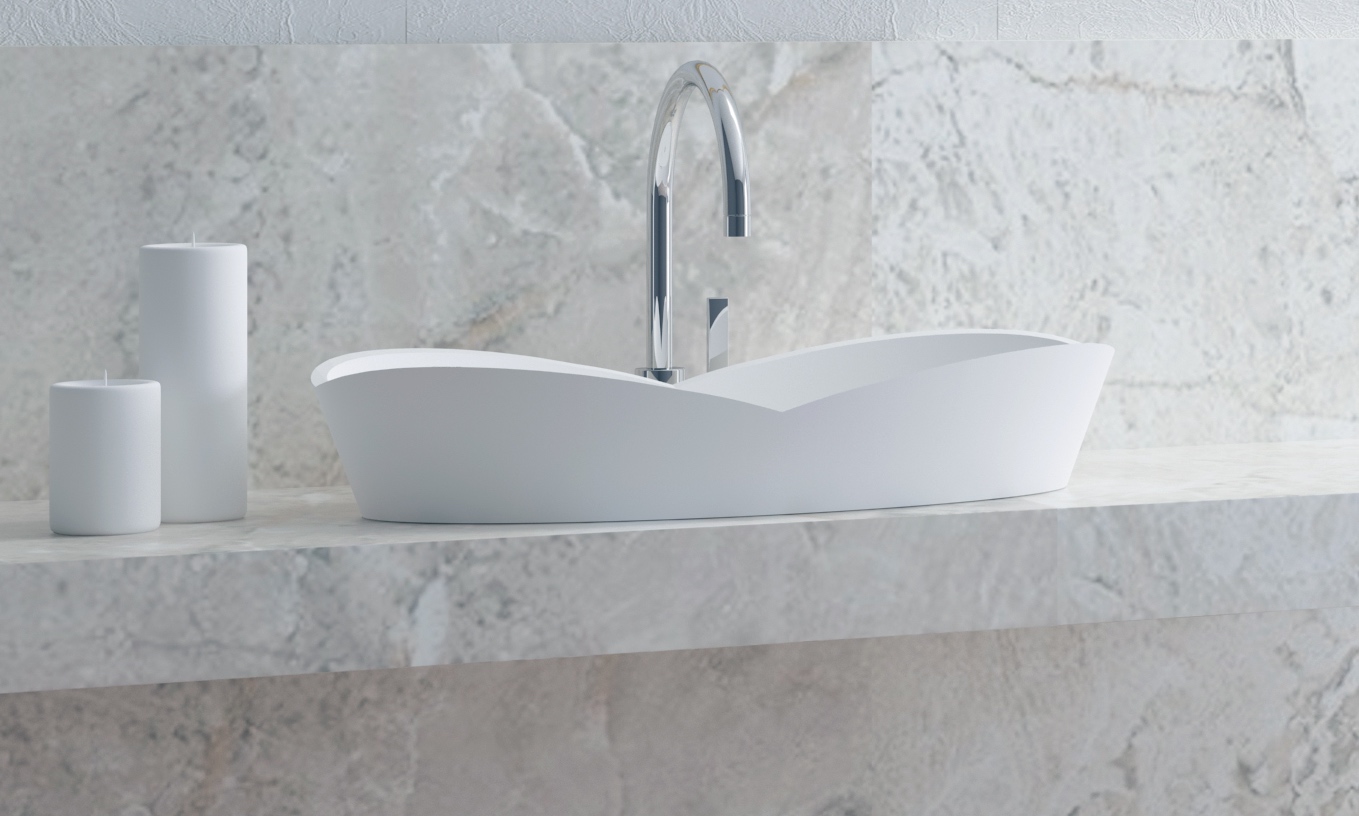 Akmens masas izlietne Cupido – uz virsmas novietojama izlietne ar perfekti glancētu virsmu Dizainiski saskaņota ar vannu Cupido, bet iespējams komplektēt arī ar kādu citu AURA™ vannu, izvēloties piemērotāko no mūsu vannu klāsta.