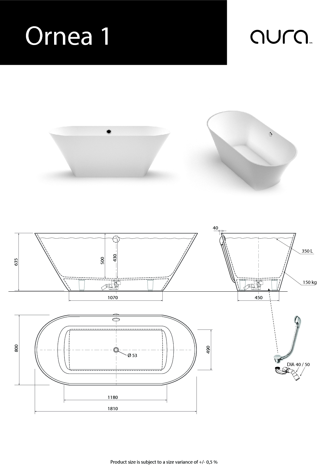 (vanna ar pārplūdi pēc pieprasījuma) Vannas ārpusei pieejami toņi no universālās RAL krāsu sistēmas. Brīvi stāvoša vanna Ornea 1 – kreatīva vienkāršība: vannas apakšējās daļas taisnstūrveidīgā forma lieliski harmonē ar augšējās daļas apaļīgo dizainu. Vanna Ornea – akmens masas vanna ar perfekti glancētu virsmu Papildus var komplektēt ar Ornea izlietni, vai izvēloties kādu no AURA™ izlietņu klāsta.